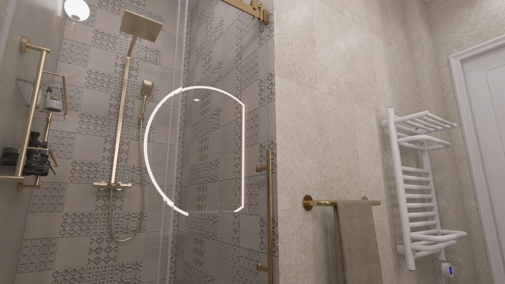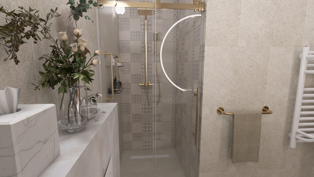 Kabina typu walk-in została stworzona z myślą o codziennej wygodzie – przesuwne drzwi chronią przed rozchlapywaniem wody, a ścienna półka mieści wszystkie niezbędne kosmetyki.