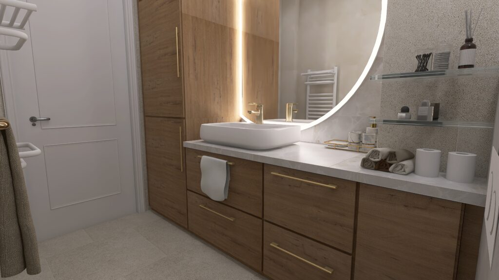 Dobrałam do tego meble z najwyższej jakości drewna które wprowadzają do wnętrza ciepło i naturalność – otwierając je, można poczuć przyjemny rytuał porannego przygotowywania się do dnia w uporządkowanej i eleganckiej przestrzeni.