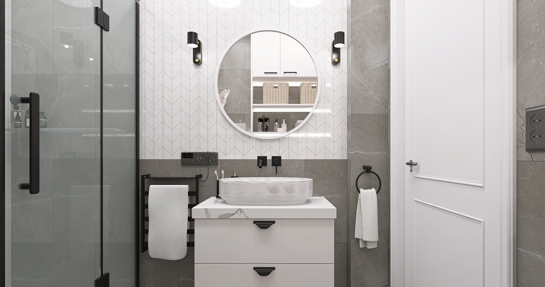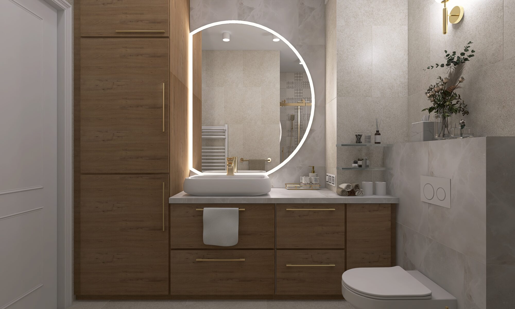 Wnętrze utrzymane jest w jasnych, przytulnych barwach – szarości i delikatna mozaika zostały połączone z subtelną imitacją marmuru w ciepłej tonacji. Złota armatura ociepla przestrzeń, a LED pod lustrem i kinkiet nad toaletą budują przyjemny klimat