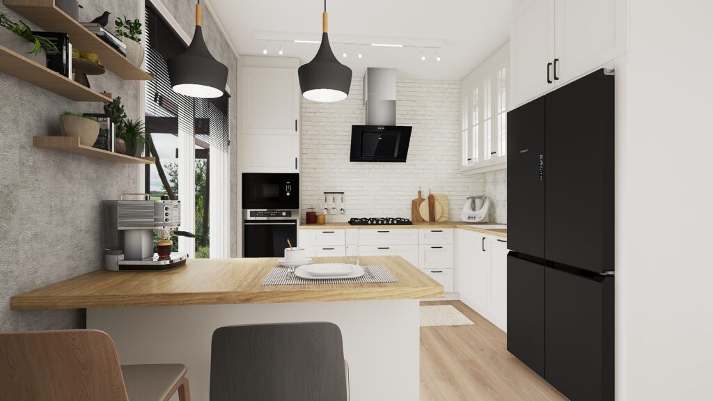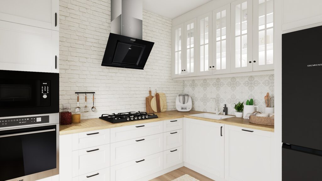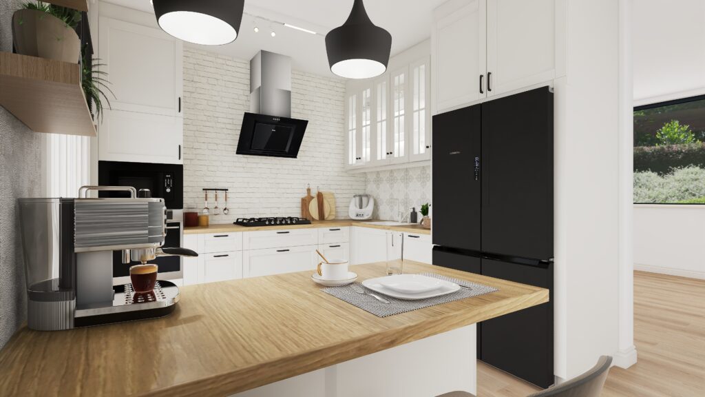 Wybrałam styl skandynawski w chłodniejszych odcieniach, z subtelnym dodatkiem szarości. Biała cegła za kuchenką wprowadza ciepło i strukturę, a naturalne światło podkreśla prostotę i harmonię form.
