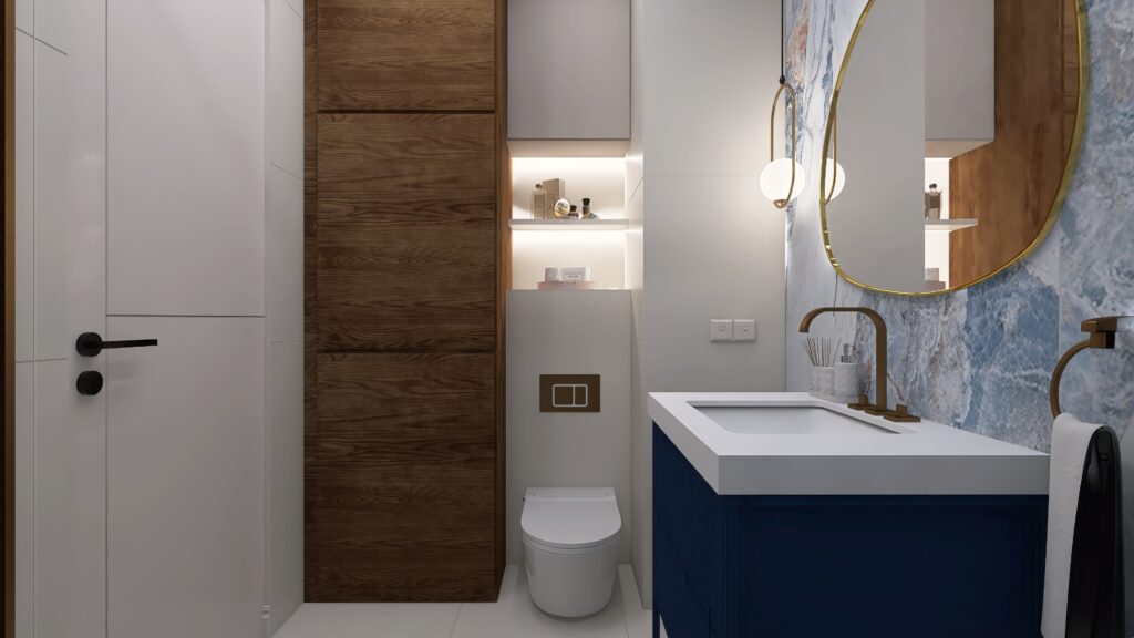 Łazienka wprowadza nowy akcent do mieszkania – szafirowy kolor zestawiony z ciemnym drewnem i mosiężnymi dodatkami. Żyły na płytach Gres Rover Crown od Tubądzin nawiązują do ujścia rzeki, co wkomponowuje się w naturalny klimat całego mieszkania. Jasne lazurowe żyły pięknie łączą się z szafirową szafką.