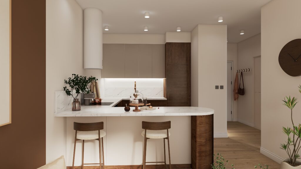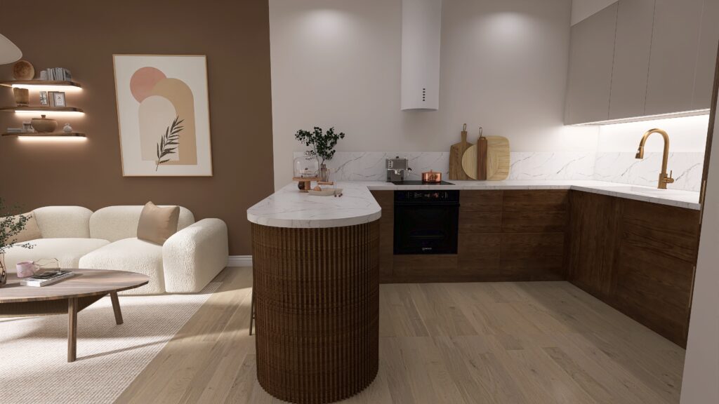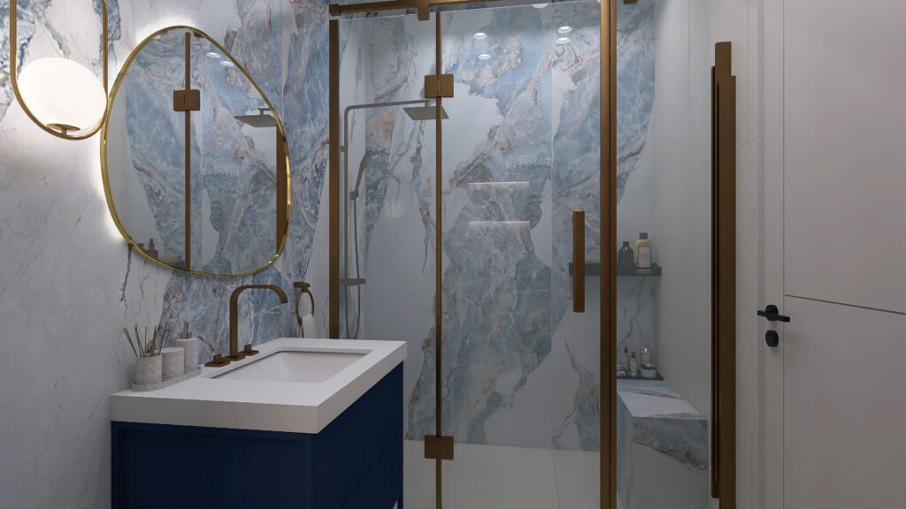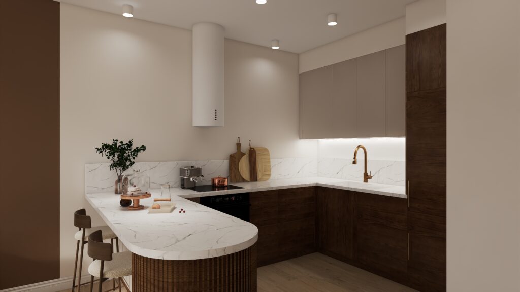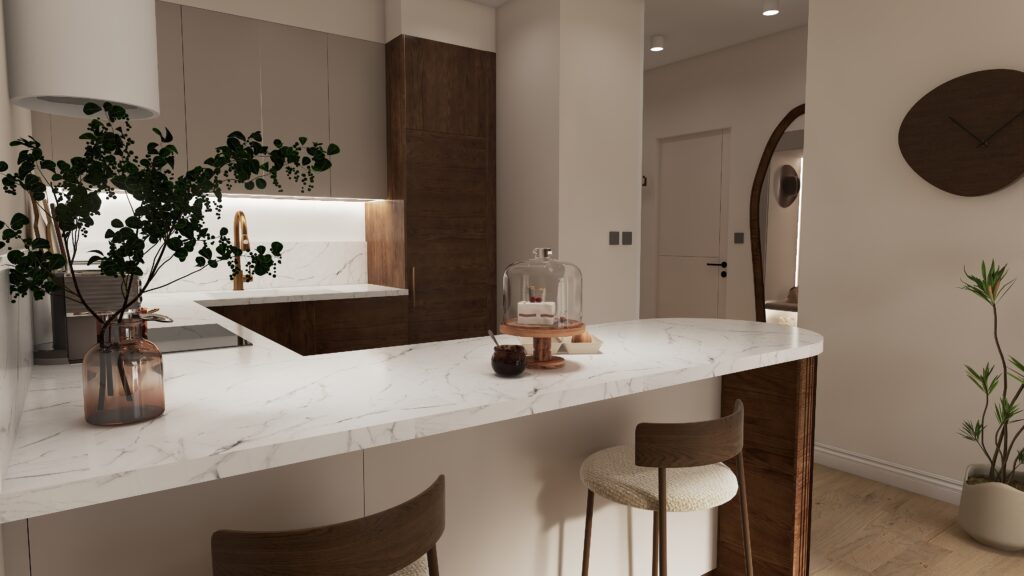 Wysokiej jakości gres na ścianach i blaty z marmuru nadają wnętrzu ponadczasowy charakter – każdego ranka przypominają mieszkańcom, że otaczają się wyjątkowym pięknem i luksusem, nawet w najprostszych chwilach.