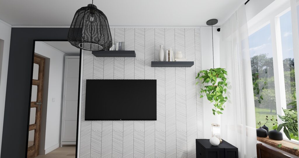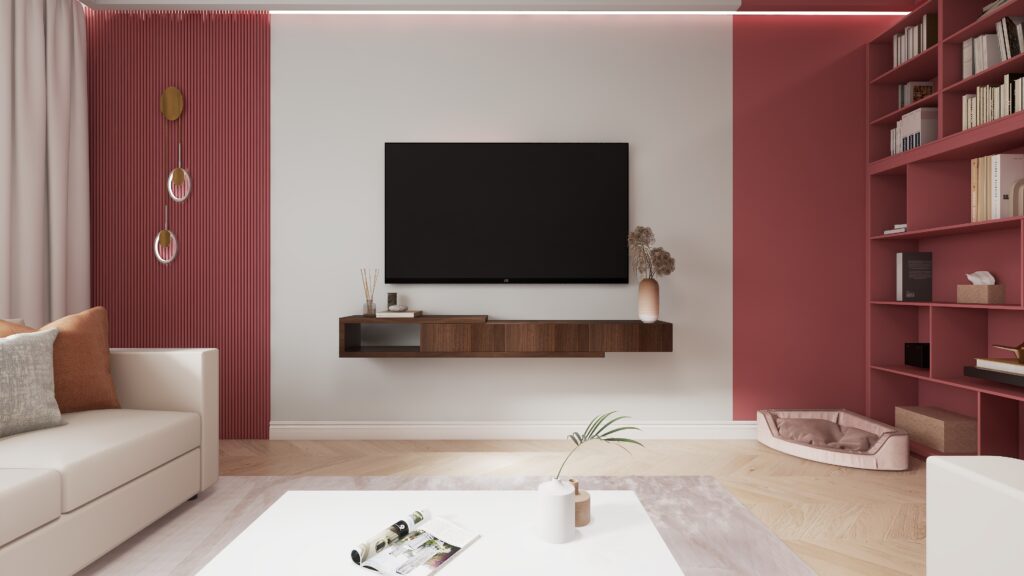 Ryflowane panele obok telewizora i zabudowa w jednym odcieniu tworzą spójną kompozycję, a delikatna linia LED ukryta w listwach dodaje wnętrzu miękkiego, przytulnego światła.