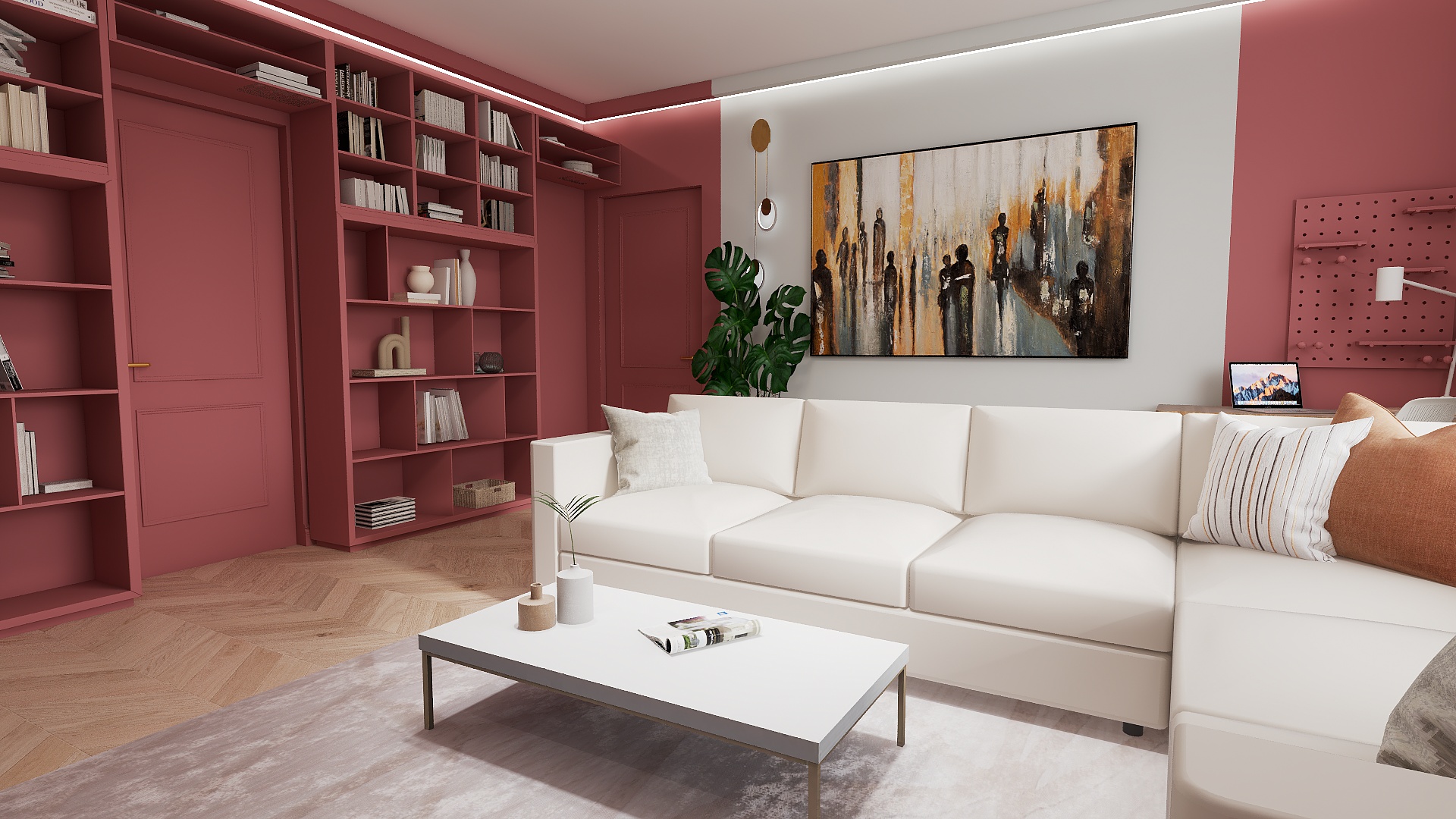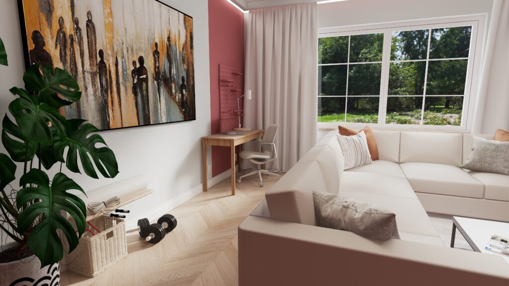 Za sofą zaplanowałam subtelną, niemal ukrytą strefę pracy — biurko wtapiające się w tło tak, aby nie zakłócać spokoju wnętrza. Obok niego znalazło się sprytne miejsce na akcesoria treningowe, dzięki czemu w kilka chwil można stworzyć mini siłownię, bez przesuwania mebli czy szukania gadżetów. To rozwiązanie, które daje pełną swobodę — pracujesz, ćwiczysz, odpoczywasz… wszystko w jednym miejscu, ale bez wizualnego chaosu.