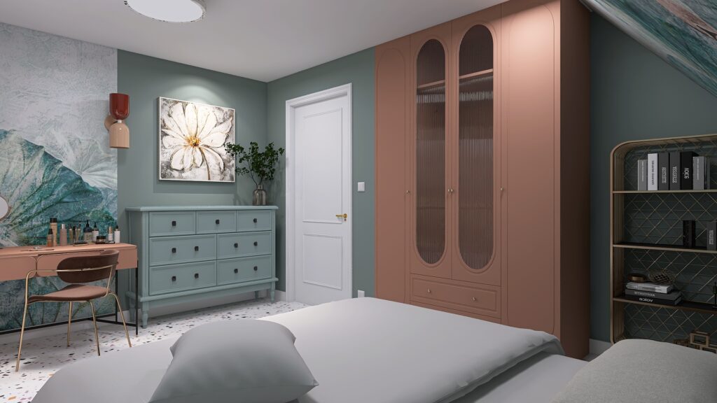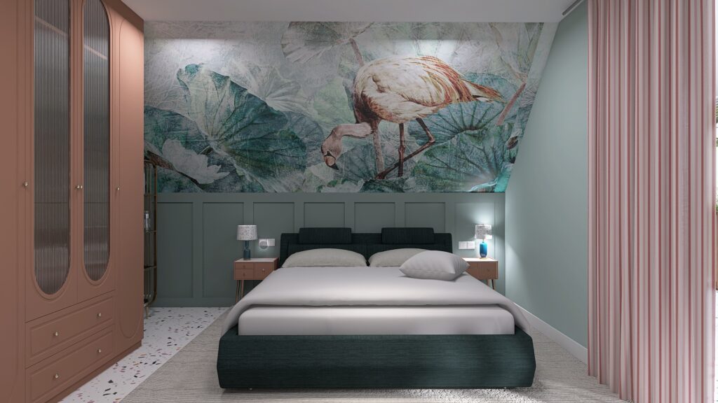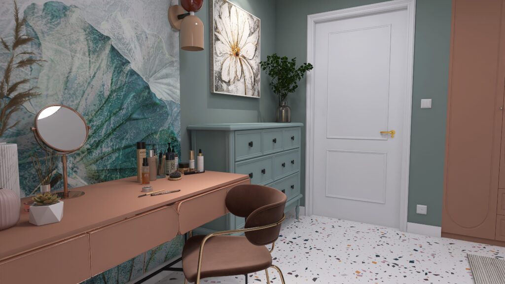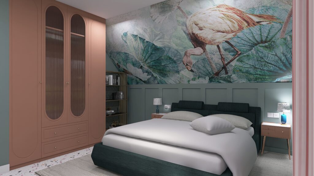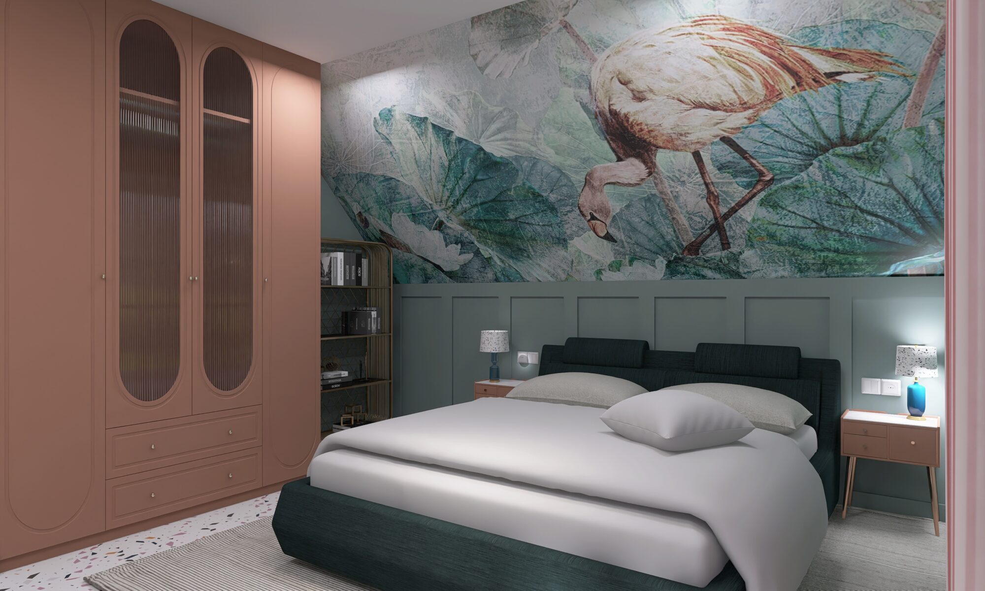 Na ścianie kolankowej zaproponowałam sztukaterię, która płynnie przechodzi w tapetę we flamingi od Ubierz Swoje Ściany – miało być odważnie, kolorowo i z charakterem. Duże tapicerowane łóżko wtapia się w przestrzeń, dając miękkość i komfort, a toaletka, komoda i szafa na zamówienie z przeszkleniami w brzoskwiniowym odcieniu odpowiadają na realne potrzeby mieszkańców – bo przechowywania nigdy za wiele