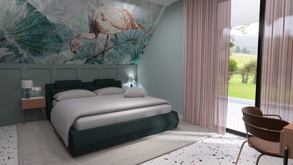 W sypialni króluje duże, wygodne łóżko z miękkim tapicerowanym wezgłowiem — zapraszające do odpoczynku po aktywnym dniu. Zobacz jak sprytnie tapeta na oklejone koło z płyty stworzyła obraz, który nad łóżkiem, subtelnie nawiązuje do organicznych kształtów całego wnętrza.