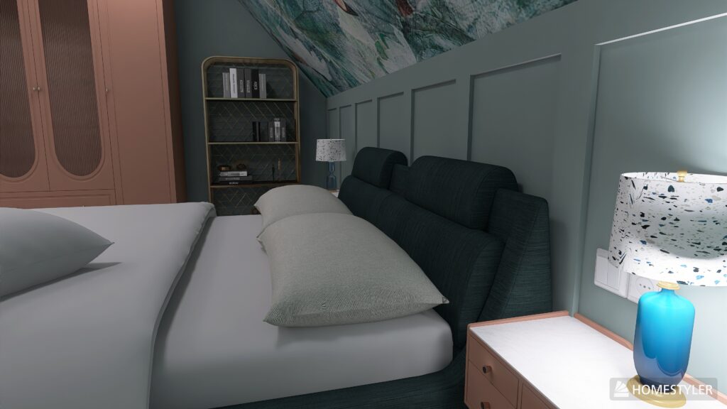 Kolory, faktury i materiały w sypialni zostały dobrane tak, aby podkreślały charakter lastryko, ale go nie przytłaczały.