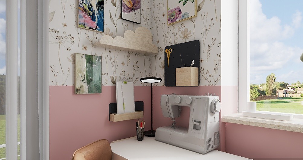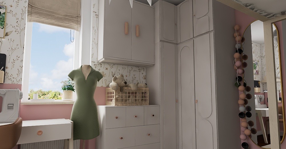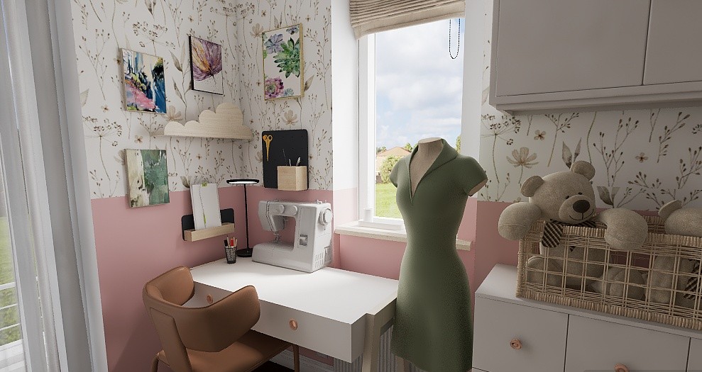 Tuż obok umieściłam maszynę do szycia z łatwym dostępem do wszystkich niezbędnych akcesoriów oraz manekina. Nad biurkiem mała artystka może eksponować swoje prace i otaczać się tym, co tworzy.