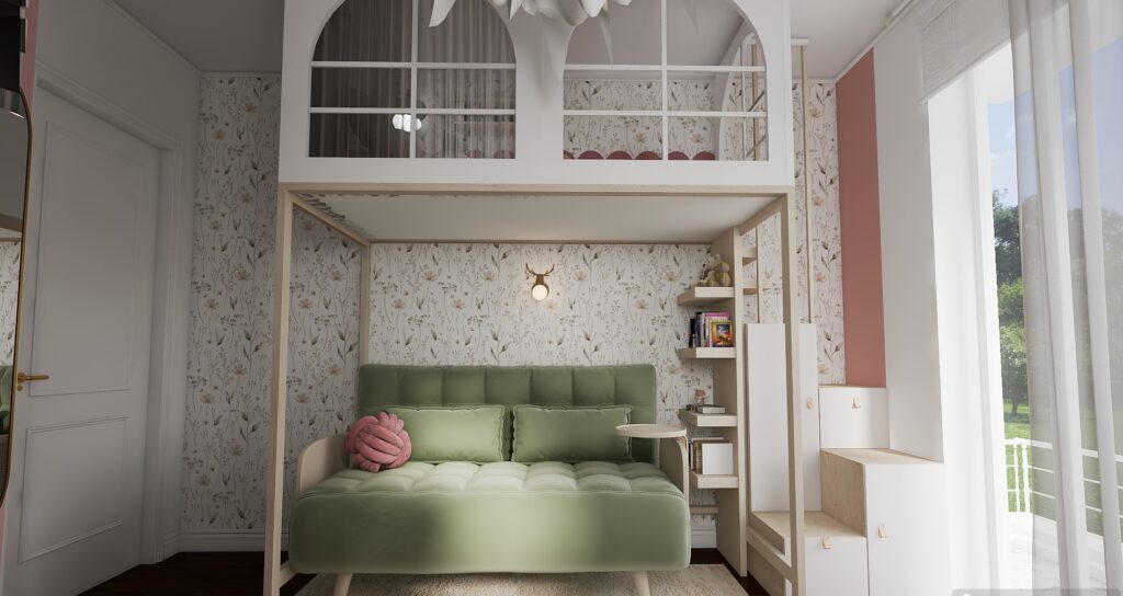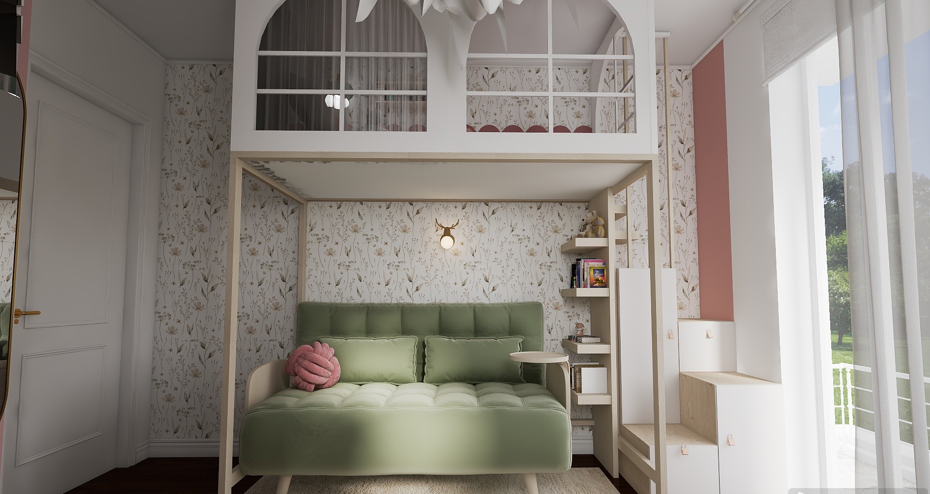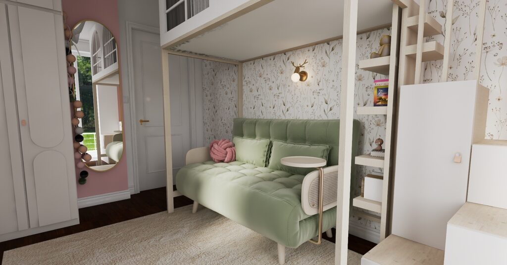 Zaprojektowane na wymiar łóżko z antresolą, do którego prowadzą schody z pojemnymi szafkami, pozwoliło maksymalnie wykorzystać przestrzeń. Dzięki temu na dole znalazło się miejsce na wygodną kanapę – idealną, kiedy wpadnie koleżanka na noc. Zieleń kanapy idealnie współgra z kwiecistą tapetą i pastelowo-różowymi dodatkami.