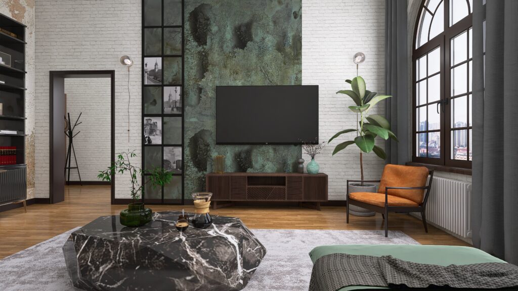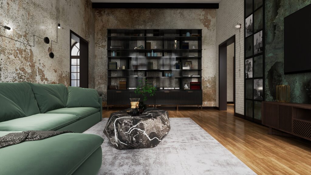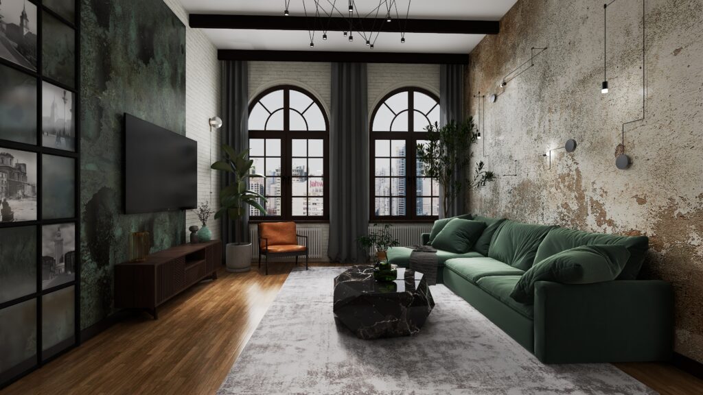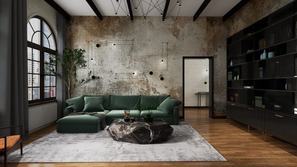 W pierwszym kroku zestawiłam tapetę imitującą stary zielony tynk i ścianę z postarzanym betonem z dużą, zieloną sofą – jej kolor miał wprowadzić energię i stać się centrum wspólnego wypoczynku.