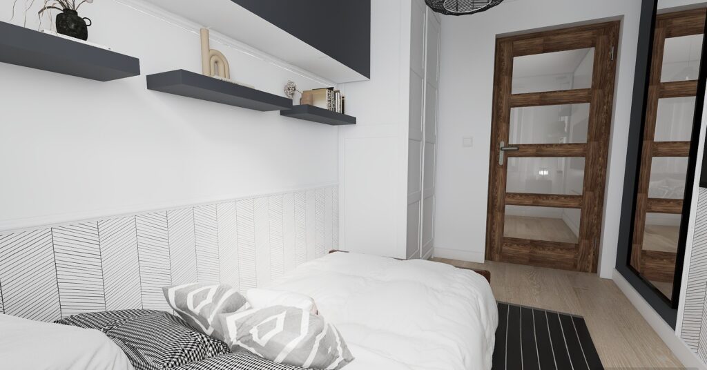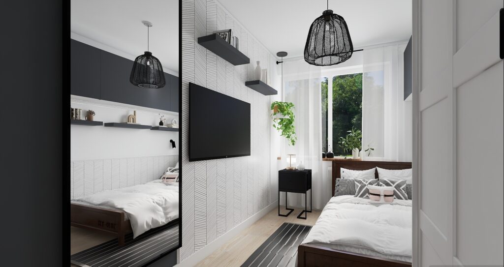 Każdy element został starannie zaplanowany: od ustawienia łóżka, po ukryte miejsca do przechowywania, które pozwalają zachować porządek i minimalizm. Dzięki temu nawet na kilku metrach kwadratowych udało się stworzyć przestrzeń nie tylko estetyczną, ale i wygodną w codziennym użytkowaniu.