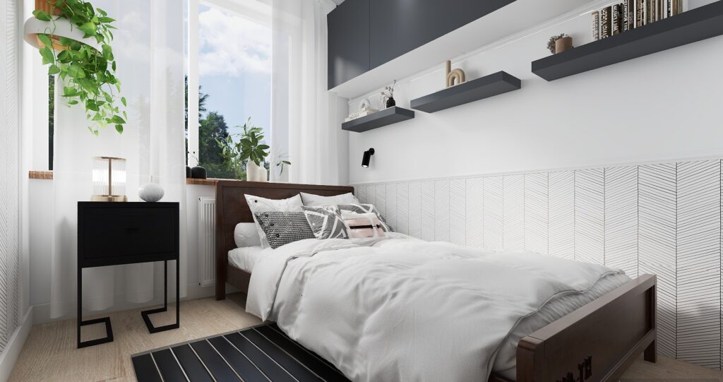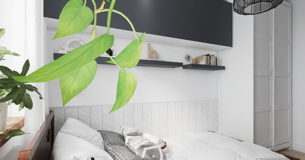 Ta sypialnia w minimalistycznej aranżacji pokazuje jak wiele można zyskać w małej przestrzeni, kiedy wszystkie elementy będą dokładnie przemyślane.