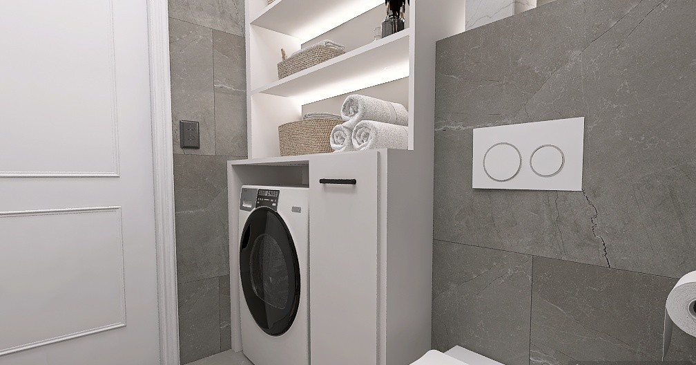 Zabudowa meblowa została wykonana na wymiar – dzięki temu w szafie schowałam pralkę , nad nią umieściłam praktyczny kosz na pranie, a wyżej dodatkową przestrzeń do przechowywania.