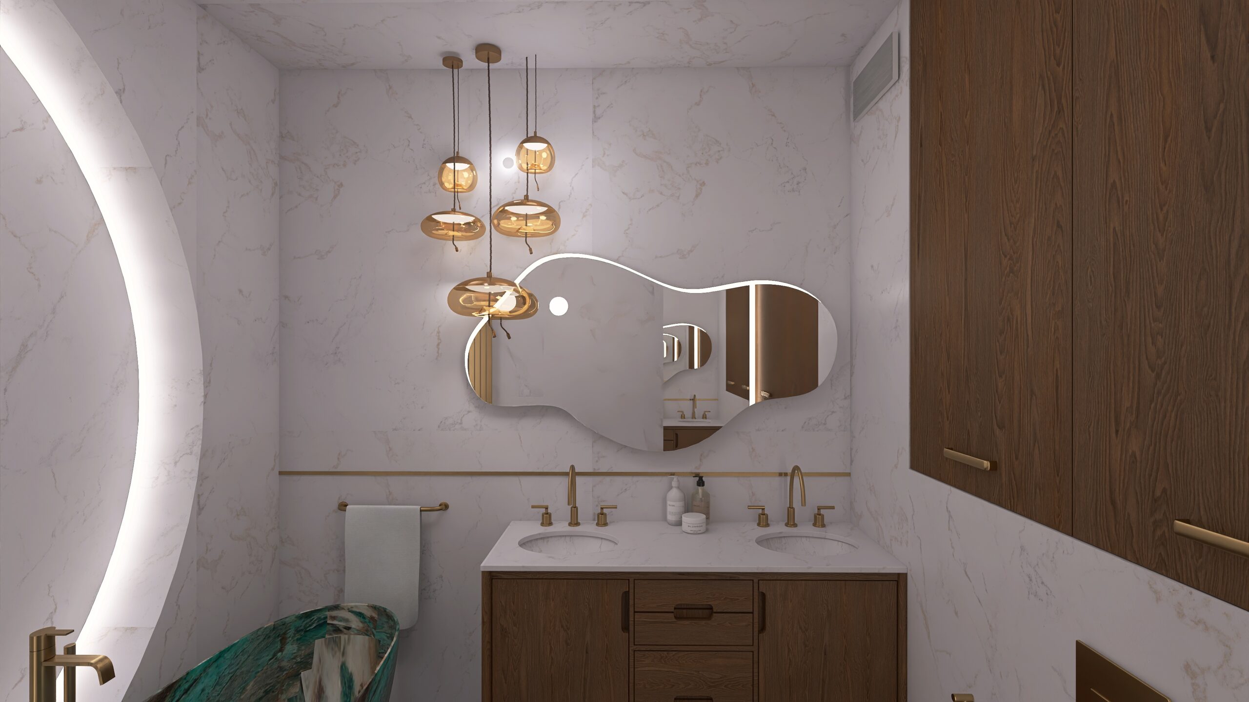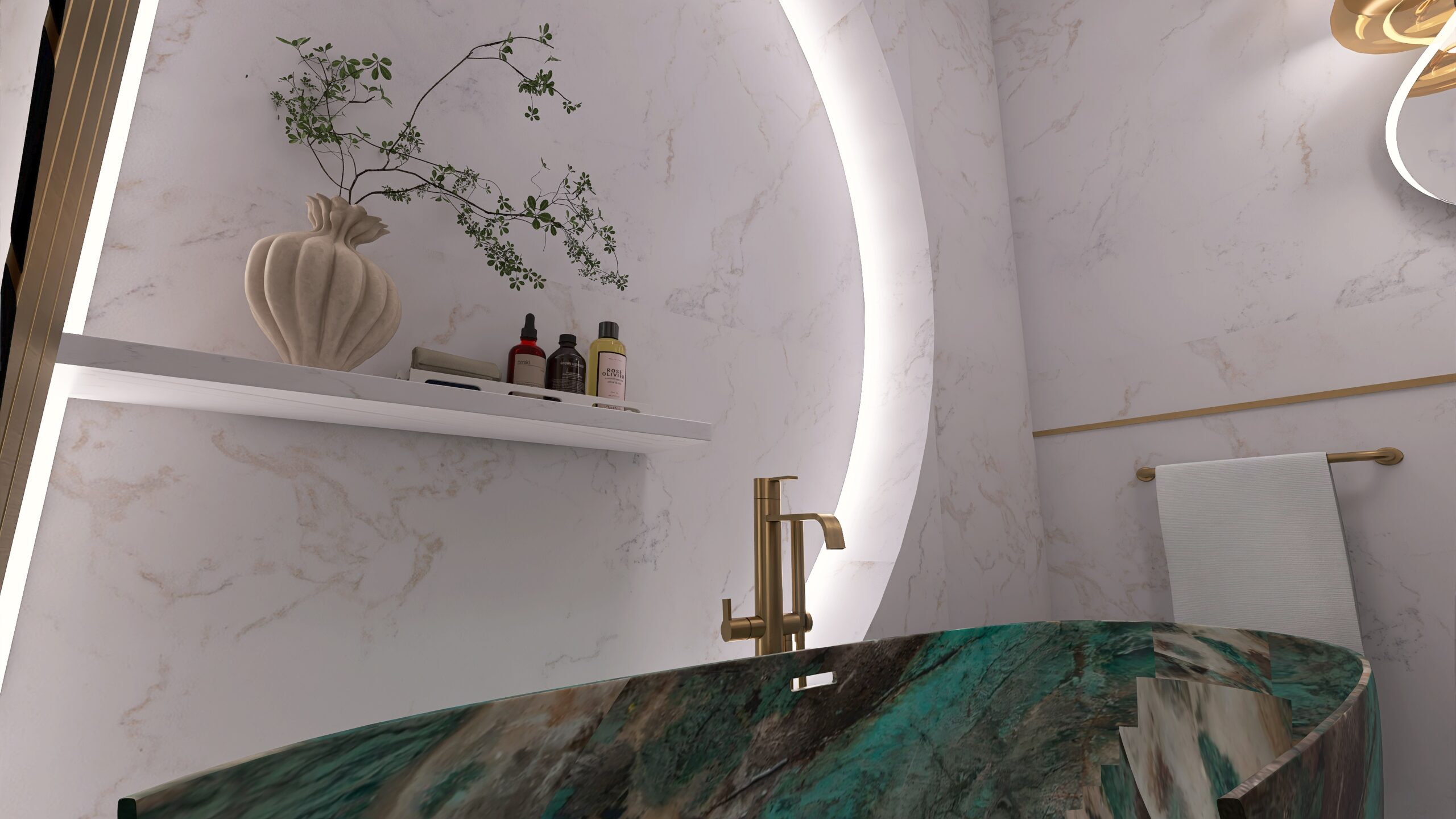 💫Subtelne oświetlenie LED zostało zaplanowałam tak, by budować nastrój i podkreślić szlachetność marmurowych wykończeń. Zwróćcie uwagę na to jak unikatowa lampa współgra z ręcznie wykonanym lustrem na zamówienie.🔎