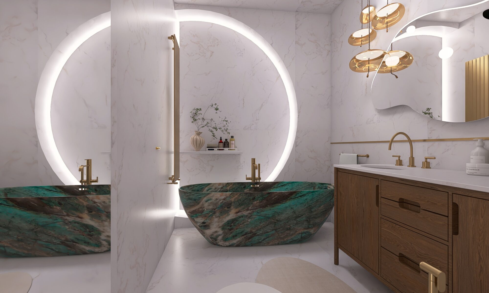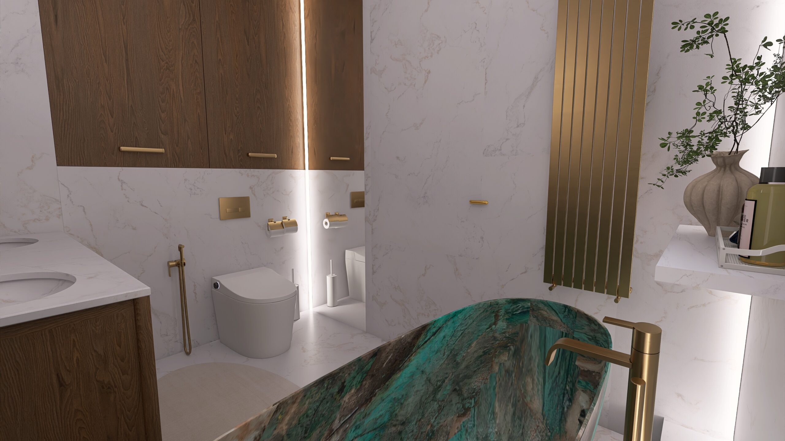 Moim zadaniem było połączyć elegancję z funkcjonalnością i dopasować każdy element do ich stylu życia. Dlatego centralnym punktem wnętrza stała się turkusowa wanna z rzadkiego marmuru Lusso Tiffany 👑- to prawdziwa królowa tego projektu – dokładnie taka, o jakiej marzyli, by mogła stać się sercem ich prywatnej strefy relaksu. 🛀🔥
